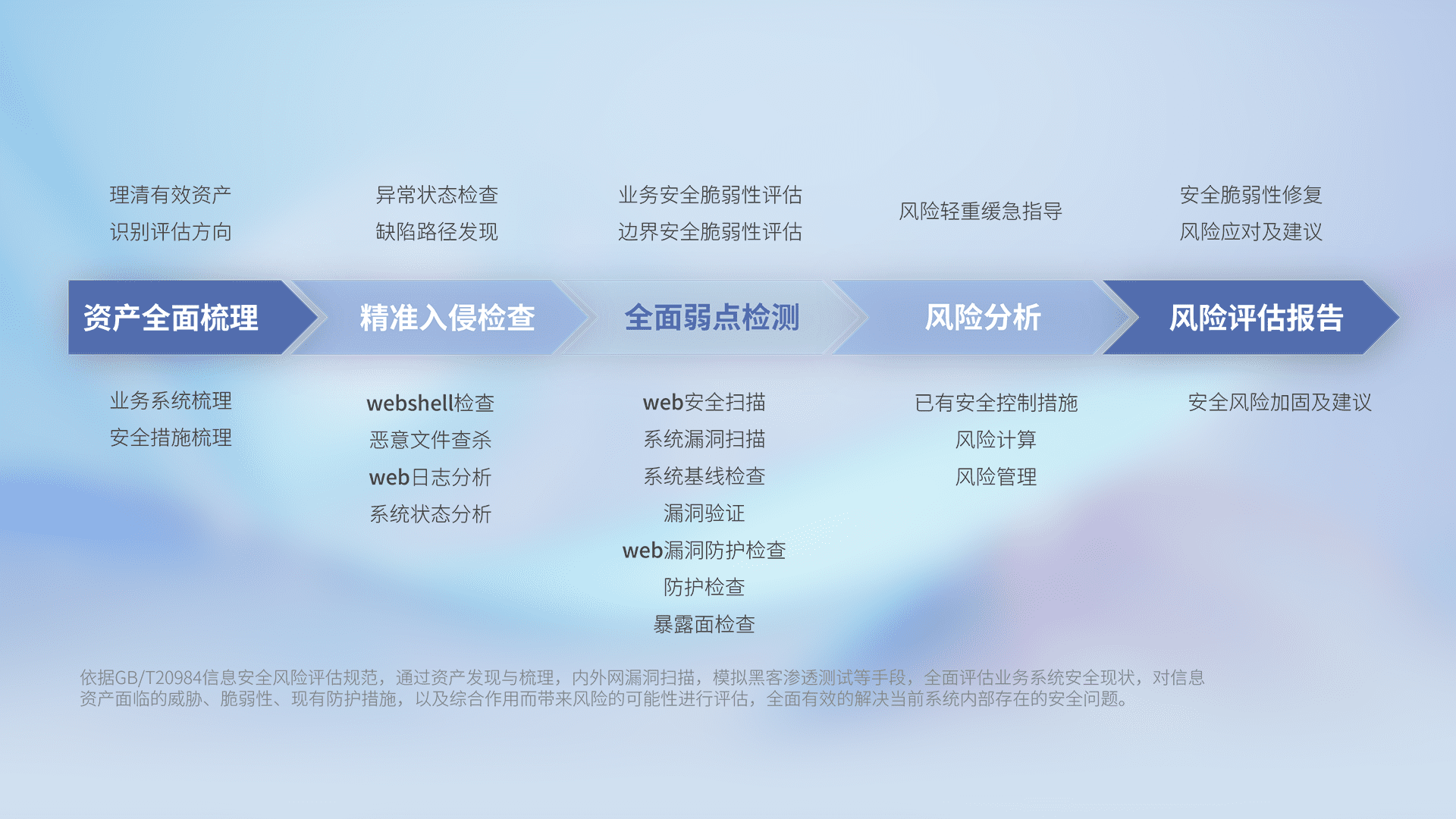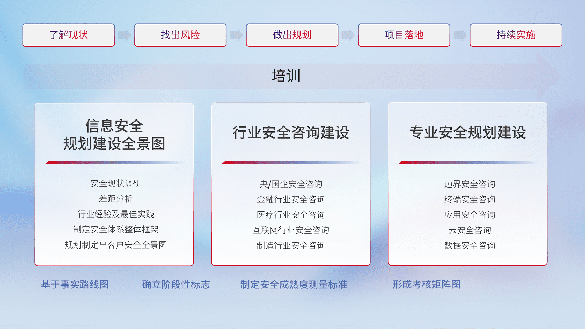 针对客户行业特性,,以专业的安全服务+多厂商联合解决方案提供专属的一站式安全管理服务,,帮助客户全面感知网络空间威胁,,基于识别、、检测、、分析、、、、防护、、、、监测、、响应的服务理论模型,,从方案咨询、、、集成交付、、、评估验证、、、优化加固、、、运维运营,,致力于为客户提供完整的闭环管理式安全服务。。以实战经验为客户打造高抵御风险的安全体系,,帮助客户发现威胁、、、、对抗威胁、、、处置威胁,,不断积累安全对抗能力,,,持续保障数字化安全。。